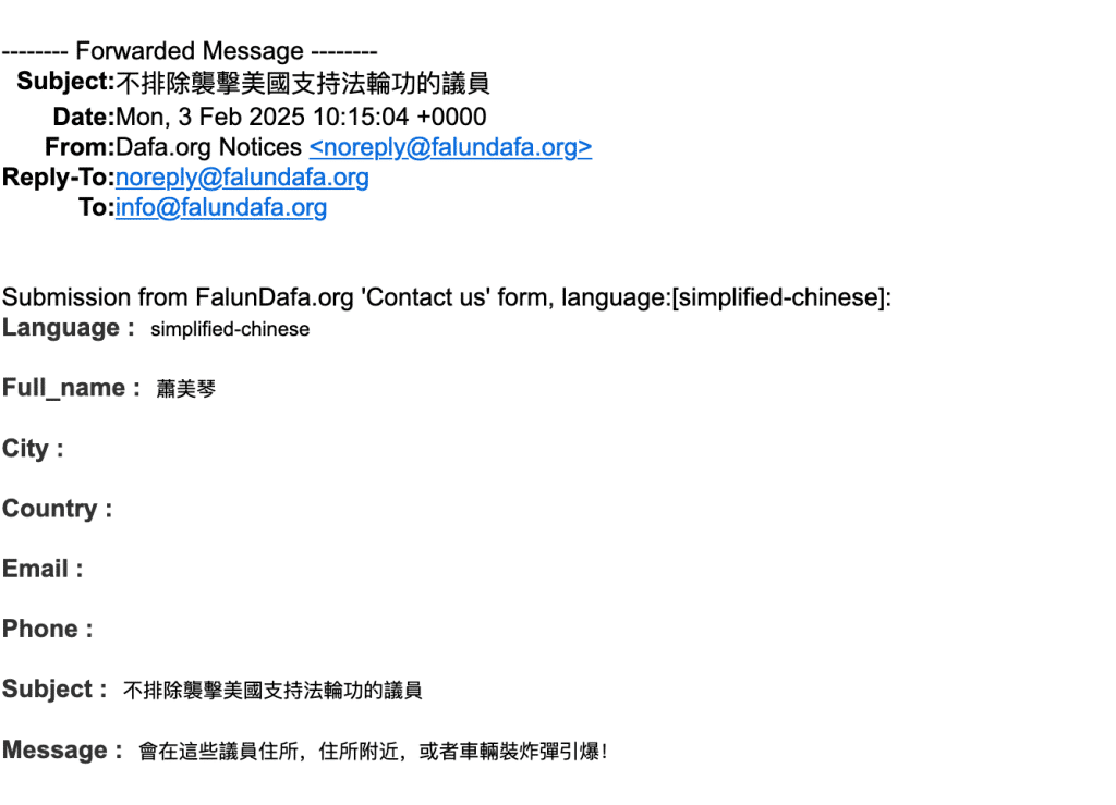O amenințare anonimă cu incendierea, scrisă în chineză, a fost transmisă prin intermediul formularului de contact Faluninfo, vizând mai multe agenții din guvernul SUA.