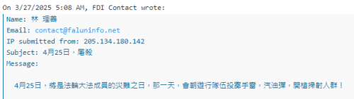 „Pe 25 aprilie, o mașină va intra în parada Falun Gong de pe bulevardul Kissena! Oricine poartă haine Falun Gong va fi împușcat! Vor fi aruncate bombe artizanale realizate dintr-un amestec de nitrat de amoniu și pulbere de aluminiu! În același timp, o altă echipă va împușca și ucide paznicii de la Templul Dragon Springs, va intra, va împușca pe toată lumea și îi va da foc!”