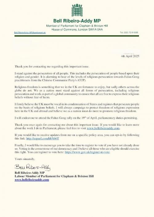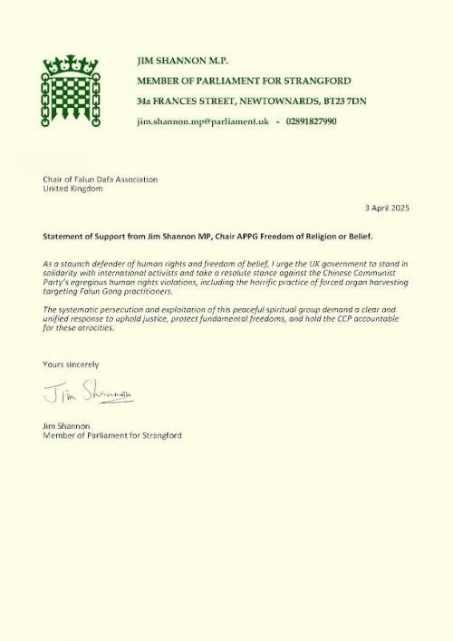 „În calitate de apărător ferm al drepturilor omului și al libertății de credință, îndemn guvernul Regatului Unit să fie solidar cu activiștii internaționali și să adopte o poziție fermă împotriva încălcărilor flagrante ale drepturilor omului comise de Partidul Comunist Chinez, inclusiv față de practica îngrozitoare a recoltării forțate de organe care vizează practicanții Falun Gong.