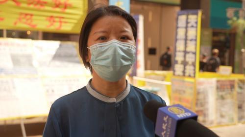 Dna Chen (alias) a fost martoră la distrugerea standului cu informații Falun Dafa din districtul Mong Kok. Ea a criticat PCC pentru terorizarea cetățenilor. Hong Kong nu mai este sigur. Sunt terifiată să ies din casă, deoarece nu știu cine sunt acești oameni. PCC a distrus Hong Kong-ul.” De asemenea, speră că guvernul din Hong Kong poate ajuta oamenii și nu îi va trata ca pe inamici.