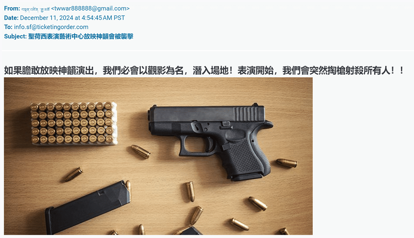 La 5 februarie 2025, o amenințare anonimă a fost trimisă prin intermediul formularului de contact al falundafa.org, principalul site web de pe care pot fi descărcate gratuit învățăturile Falun Gong și videoclipurile cu instrucțiuni pentru exercițiile fizice. Expeditorul, care se dădea drept prim-ministrul japonez Shigeru Ishiba, pretindea în chineză simplificată că a pătruns în sistemele informatice ale teatrelor care găzduiesc spectacole Shen Yun și a obținut informații despre personal, avertizând că membrii personalului și familiile acestora sunt în pericol. Amenințarea provenea de la o adresă IP din Franța (51.158.240.91), probabil rezultatul unui server VPN utilizat pentru a păstra anonimă locația expeditorului. În aceeași zi, o amenințare similară a fost trimisă prin intermediul formularului de contact al faluninfo.net, site-ul oficial al Centrului de Informare Falun Dafa, care documentează încălcările drepturilor omului cu care se confruntă practicanții Falun Gong în China și în întreaga lume. Expeditorul, folosind aceeași adresă IP ca în cazul anterior și introducând numele lui Guan Jianzhong, un miliardar chinez, a repetat afirmațiile în chineză simplificată, specificând că unele teatre care găzduiesc Shen Yun din Statele Unite, Japonia și Italia au fost piratate. Afirmațiile privind pirateria informatică sunt cel mai probabil false.