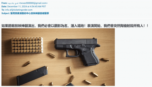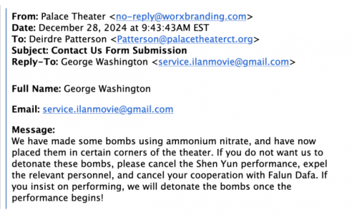 Shen Yun primește un mesaj de la un individ care pretinde că este responsabil pentru amenințările cu bombă anterioare