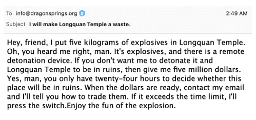 Două amenințări anonime cu bombă, scrise în chineză, au fost trimise prin formularul de contact Faluninfo.net și al site-ului Shen Yun, vizând în special Dragon Springs. Ambele e-mailuri menționează „bombe de plastic C4” și „cadavre”, indicând un efort coordonat.