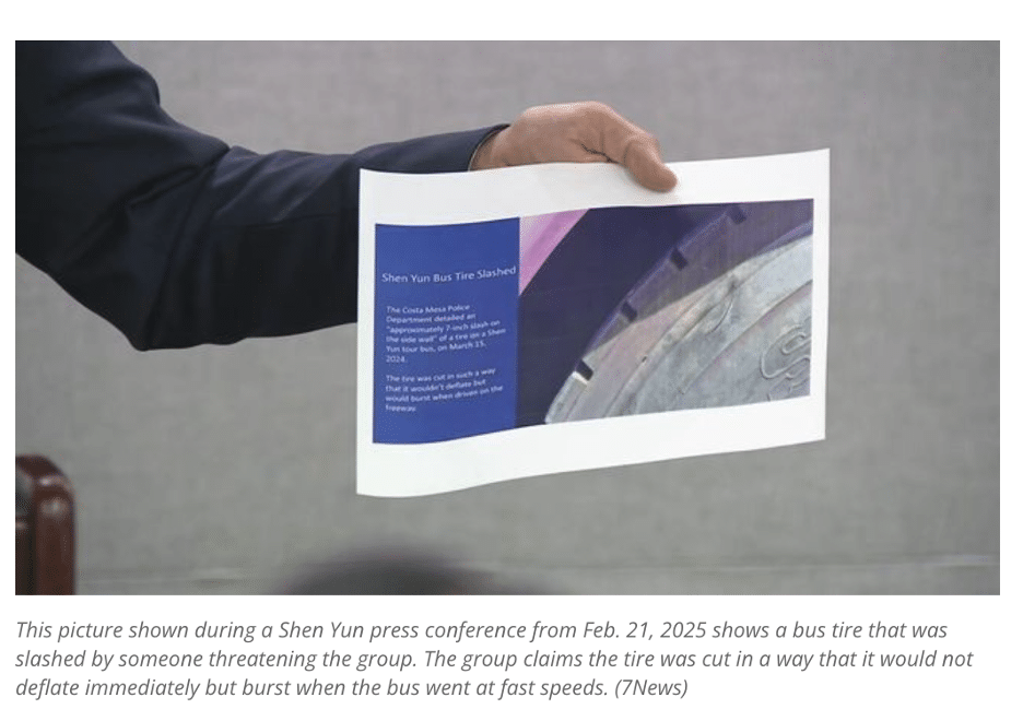 Încă din ianuarie 2024, un YouTuber sprijinit de Beijing, cunoscut deja ca un critic vocal—și adesea irațional—al Falun Gong și al Shen Yun, a menționat pe canalul său că a ținut legătura cu „Times” (cotidianul american care a publicat o serie de articole defăimătoare la adresa Shen Yun și Falun Gong). Același YouTuber este acuzat de port ilegal de arme în Statele Unite și a amenințat anterior cu acte de violență împotriva artiștilor Shen Yun.