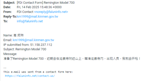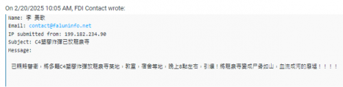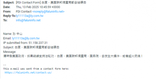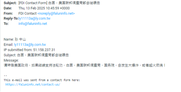O amenințare anonimă cu incendierea, scrisă în chineză, a fost transmisă prin intermediul formularului de contact Faluninfo, vizând mai multe agenții din guvernul SUA.