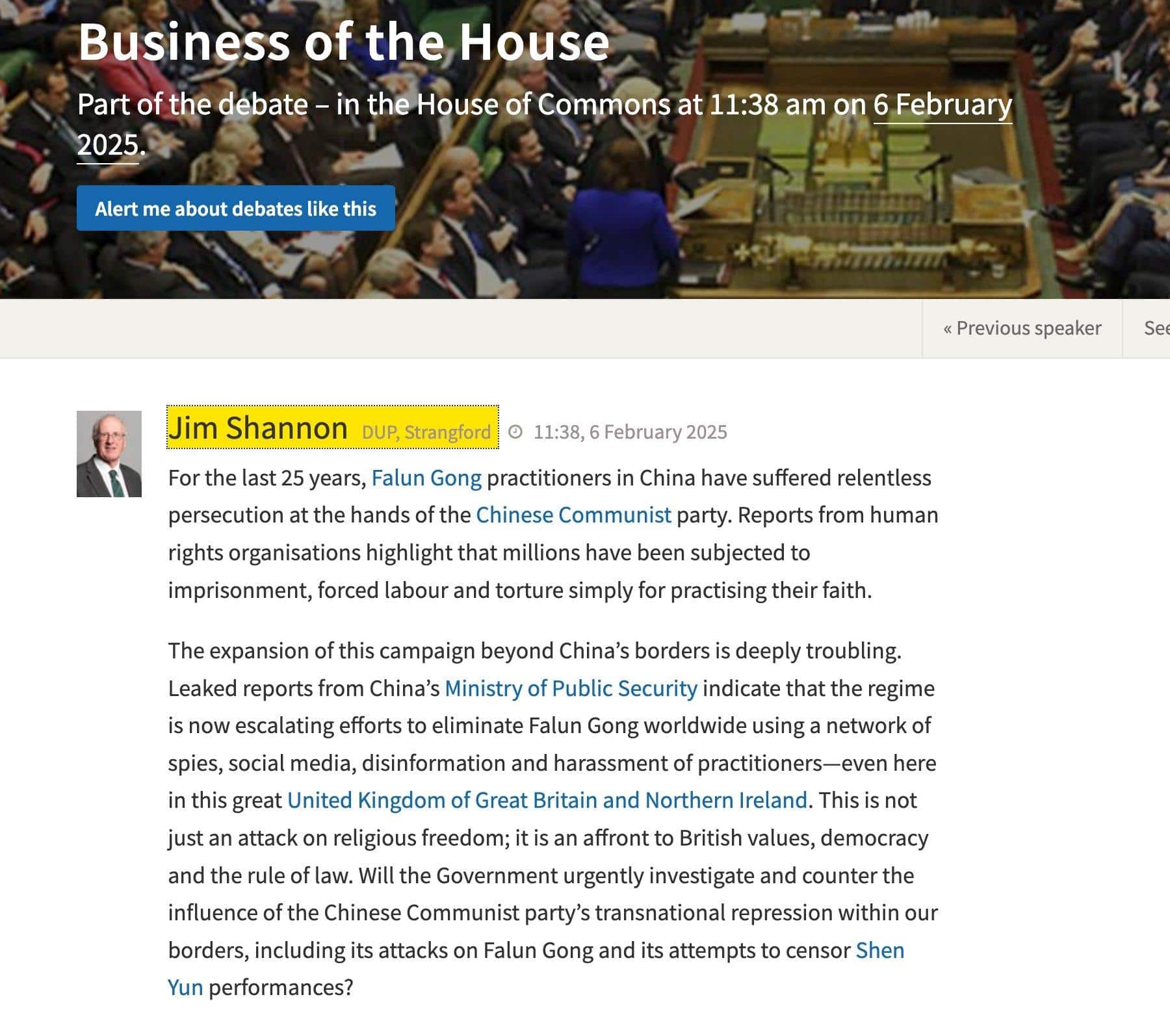 „Scurgerile de informații de la Ministerul Securității Publice din China indică faptul că regimul își intensifică acum eforturile de a elimina Falun Gong la nivel mondial, folosind o rețea de spioni, rețele sociale, dezinformare și hărțuirea practicanților—chiar și aici, în acest mare Regatul Unit al Marii Britanii și Irlandei de Nord. Acesta nu este doar un atac asupra libertății religioase; este un afront la adresa valorilor britanice, a democrației și a statului de drept. Va investiga de urgență guvernul și va contracara influența represiunii transnaționale a Partidului Comunist Chinez în interiorul granițelor noastre, inclusiv atacurile acestuia asupra Falun Gong și încercările acestuia de a cenzura spectacolele Shen Yun?”