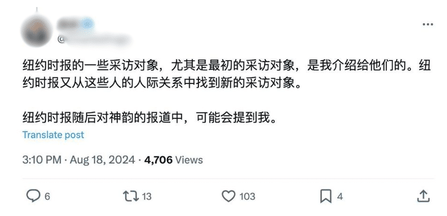 La doar câteva zile după ce „New York Times” a publicat articole problematice despre Shen Yun și Falun Gong, un YouTuber susținut de Beijing s-a lăudat pe X că: „eu am fost cel care a prezentat oamenii [foști artiști ai Shen Yun] la „New York Times”, în special pentru interviurile inițiale”. În notele scurse de la întâlnirea Ministerului Securității Publice din China din iunie 2024, acest YouTuber a fost menționat ca fiind o persoană care ar trebui să primească sprijinul regimului. YouTuberul se confruntă, de asemenea, cu acuzații de posesie ilegală de arme în Statele Unite și a amenințat cu violențe împotriva artiștilor Shen Yun și Falun Gong.