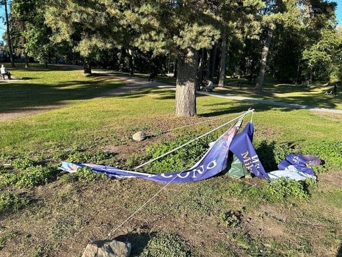 Doi tineri chinezi au doborât bannerul practicanților Falun Gong din Parcul Sibelius pe 21 septembrie 2024. (Sursa: Minghui.org)