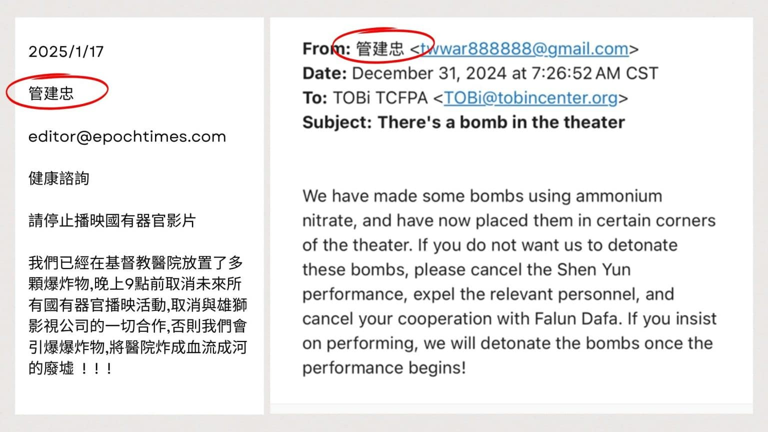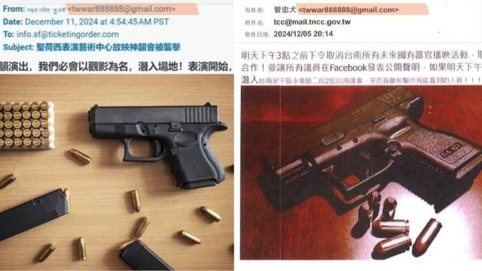 Însoțit de imagini cu gloanțe și un pistol, acest e-mail, trimis de la adresa twwar888888@gmail.com, a fost adresat Consiliului Local Tainan înaintea proiecțiilor programate în decembrie 2024. Amenințări similare au fost trimise și către Biroul Poliției Criminale, Consiliul Local Taipei și către alte instituții publice.