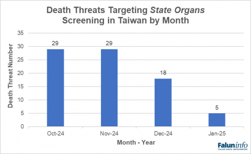 Între octombrie 2024 și ianuarie 2025, presa taiwaneză și producătorul documentarului au documentat peste 80 de amenințări cu moartea la adresa unor entități din Taiwan implicate în proiecțiile documentarului „Organele Statului”. Acest film premiat, lansat în 2024, investighează recoltarea forțată de organe susținută de Partidul Comunist Chinez (PCC), o practică care a fost documentată pe larg de anchete independente, inclusiv de Tribunalul pentru China în 2019, prezidat de Sir Geoffrey Nice QC. Tribunalul a concluzionat că recoltarea forțată de organe de la prizonierii de conștiință, în principal practicanți Falun Gong, a fost comisă „dincolo de orice îndoială”.