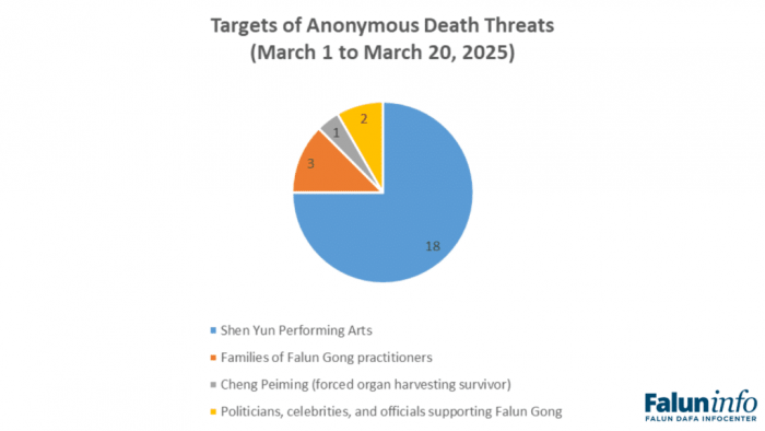 În ultimul an, s-au primit cel puțin 80 de mesaje anonime care conțineau amenințări cu violență împotriva practicanților Falun Gong, companiei Shen Yun Performing Arts (o companie de dans clasic chinezesc fondată de practicanți Falun Gong) și a unor persoane proeminente care susțin Falun Gong. Această tendință a continuat și în martie 2025, vizând persoane și locații din Statele Unite, Spania, Taiwan și Canada.