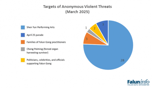 Din martie 2024, spectacolele Shen Yun, sediul companiei și alți practicanți Falun Gong au fost ținta a peste 80 de amenințări anonime cu violență, incluzând descrieri explicite de atentate cu bombă, atacuri armate și agresiuni sexuale. Numai în luna martie, 80% dintre cele 35 de amenințări documentate au vizat Shen Yun Performing Arts și locațiile spectacolelor sale. Amenințările sunt transmise, de regulă, prin e-mail sau prin intermediul formularelor de contact de pe site-uri. Până în prezent, nu au avut loc acte reale de violență. Cu toate acestea, scopul amenințărilor este acela de a intimida, de a descuraja publicul potențial și de a crește costurile de securitate.