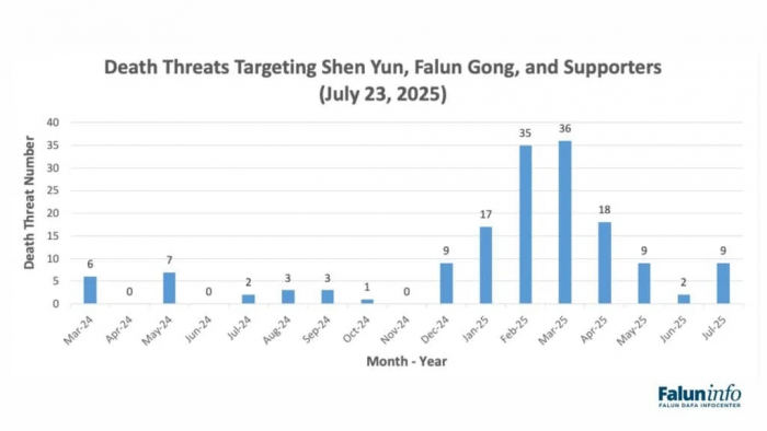 - Pe 22 iulie, două mesaje separate—ambele pretinzând a fi trimise de o rudă a fondatorului Falun Gong—au transmis amenințări grafice cu viol în grup și tortură, vizând artiste Shen Yun și femei-persoane publice care susțin Falun Gong. Unul dintre mesaje a fost trimis prin formularul de contact al Centrului de Informare Falun Dafa, iar celălalt prin formularul de contact al magazinului online Shen Yun.
