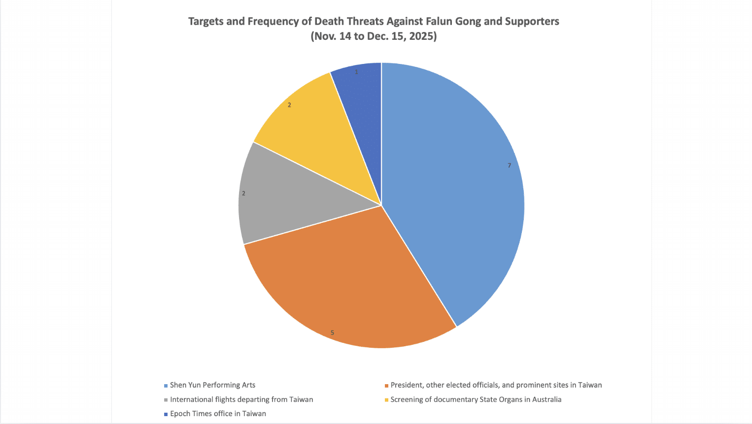 De la mijlocul lunii noiembrie până la jumătatea lunii decembrie 2025, o escaladare susținută a amenințărilor anonime, a schemelor de uzurpare a identității și a acțiunilor de intimidare transfrontalieră a vizat Falun Gong, Shen Yun Performing Arts, organizații media partenere și oficiali. Incidentele s-au extins în Taiwan, Australia și Statele Unite, autorii exploatând în mod repetat sistemele de trimitere de cereri online, conturile de e-mail falsificate și identitățile furate—inclusiv pe cele ale unor politicieni taiwanezi, activiști pentru democrație din străinătate, practicanți Falun Gong și persoane din conducerea persoanelor juridice afiliate Falun Gong.
