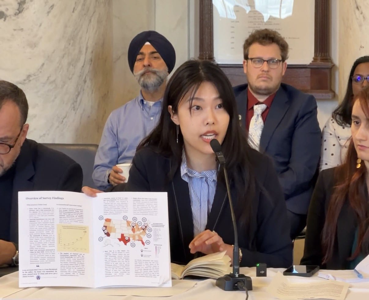 Simultan, Cynthia Sun a vorbit despre represiunea transnațională a Beijingului la Masa Rotundă IRF din clădirea de birouri a Senatului Russell. Printre dovezile citate, ea a menționat e-mailuri tulburătoare care conțineau „imagini grafice cu cuțite” și amenințări cu acte de violență împotriva americanilor care practică Falun Gong. Un altul a inclus, de asemenea, amenințări de a „răpi copiii din comunitatea noastră și de a-i arunca de pe o clădire înaltă. Aceste amenințări teroriste se potrivesc perfect cu strategia de represiune a Beijingului”. Sun a îndemnat actuala administrație să continue pe urmele celor două administrații anterioare și să utilizeze sancțiuni țintite pentru a trage la răspundere oficialii chinezi din spatele acestei campanii.